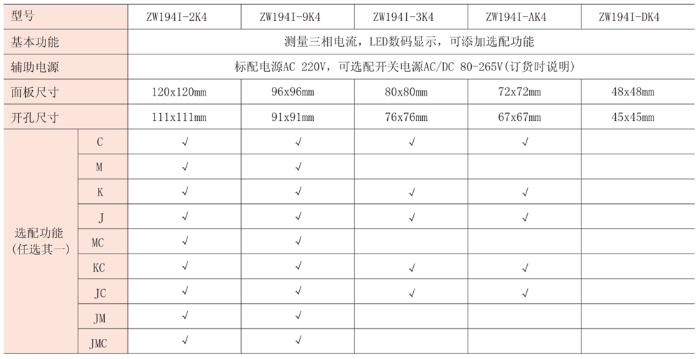注:“√”代表可選配置,“J”代表報警輸出,“M”代表模擬量輸出,“K”代表開關(guān)量輸入,“C”代表