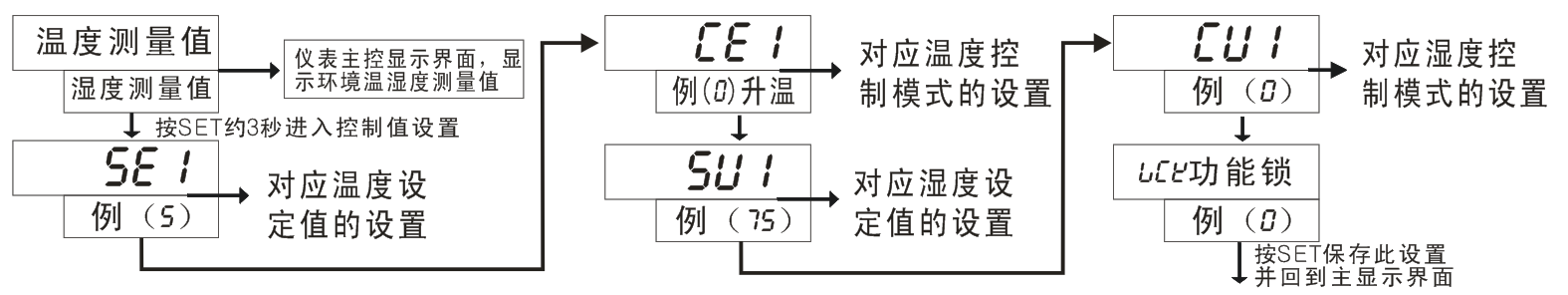 4、濕度控制模式“CU1”:可設(shè)置濕度啟控模式: 目前出廠設(shè)置默認(rèn)為除濕型。(如需加濕型啟控模式為特殊定貨,下單時(shí)特別說(shuō)明)。